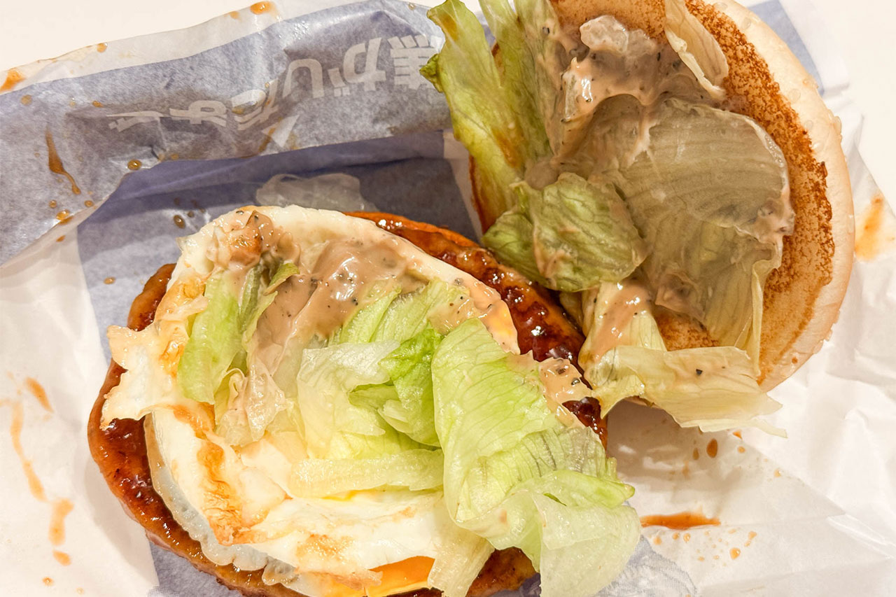 てりやきバーガー専用の「テリヤキパティ」とのことで、「焦がしにんにくマヨたまごてりやき」もテリヤキパティが使われています。