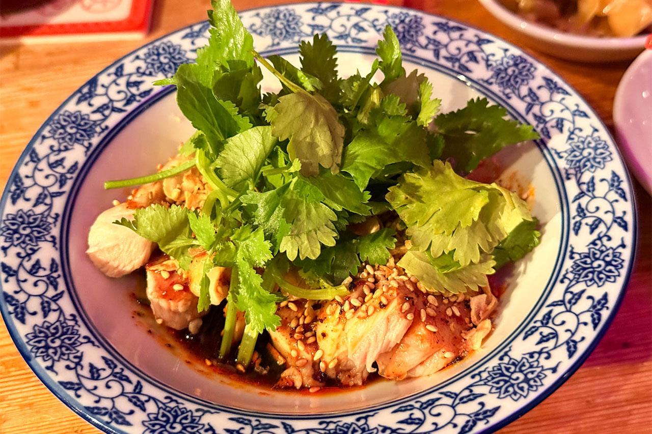 よだれ鶏。パクチーは奥さんにあげました。胡麻がたっぷりとかかっていて、鶏肉はしっとりしていて、タレは塩辛すぎず美味しかったです。