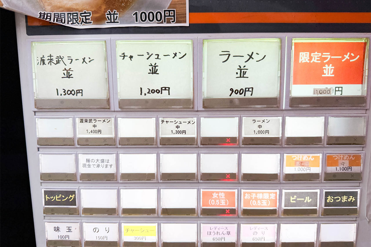 券売機のメニューがこちら。価格は2025年10月時点のものです。