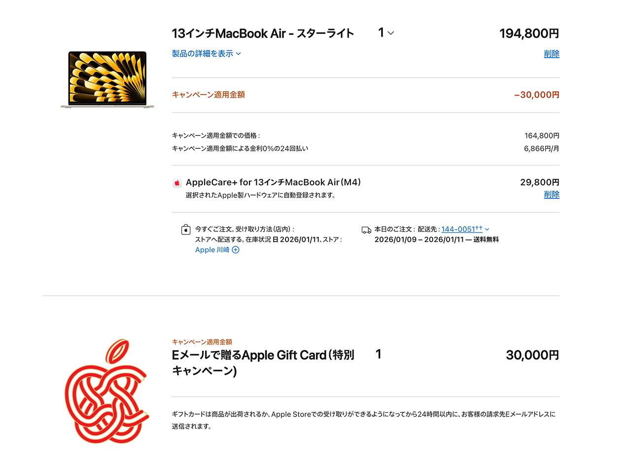 MacBook Airは、30,000円還元でした。38,000円の最大還元だったのはMacBook Proのみでしたね。