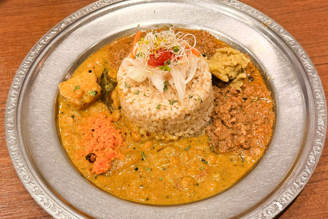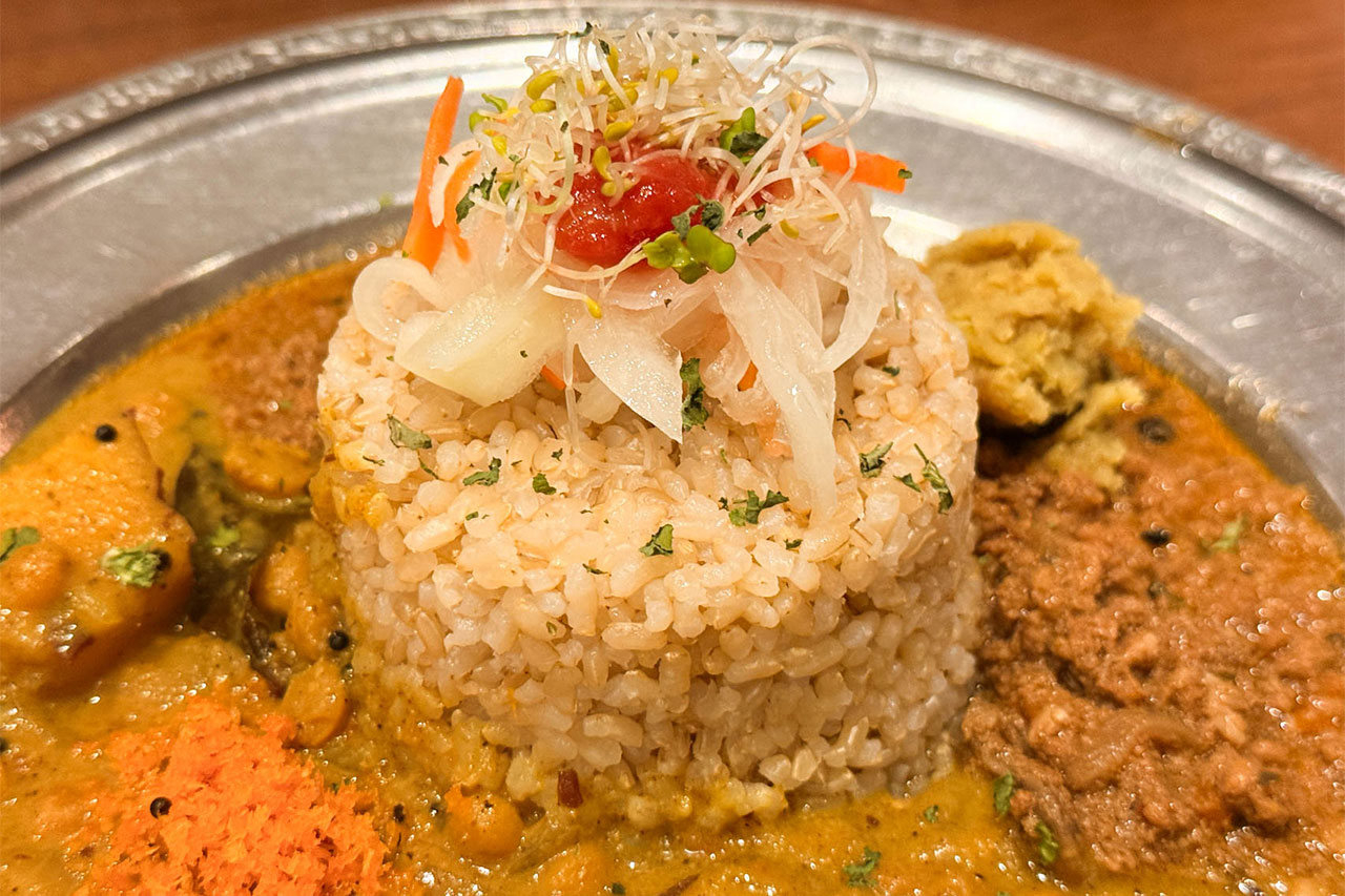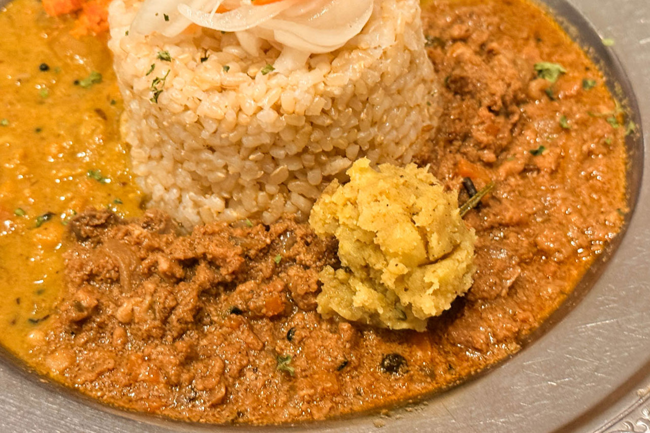 ご飯は玄米をチョイス。旧ヤム鐵道のカレーには玄米が合いそうだなと思ってたんですが正解だったと思います。上に乗った酢漬けも美味しかったです。