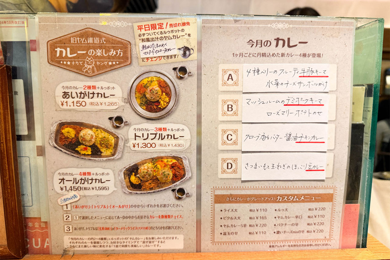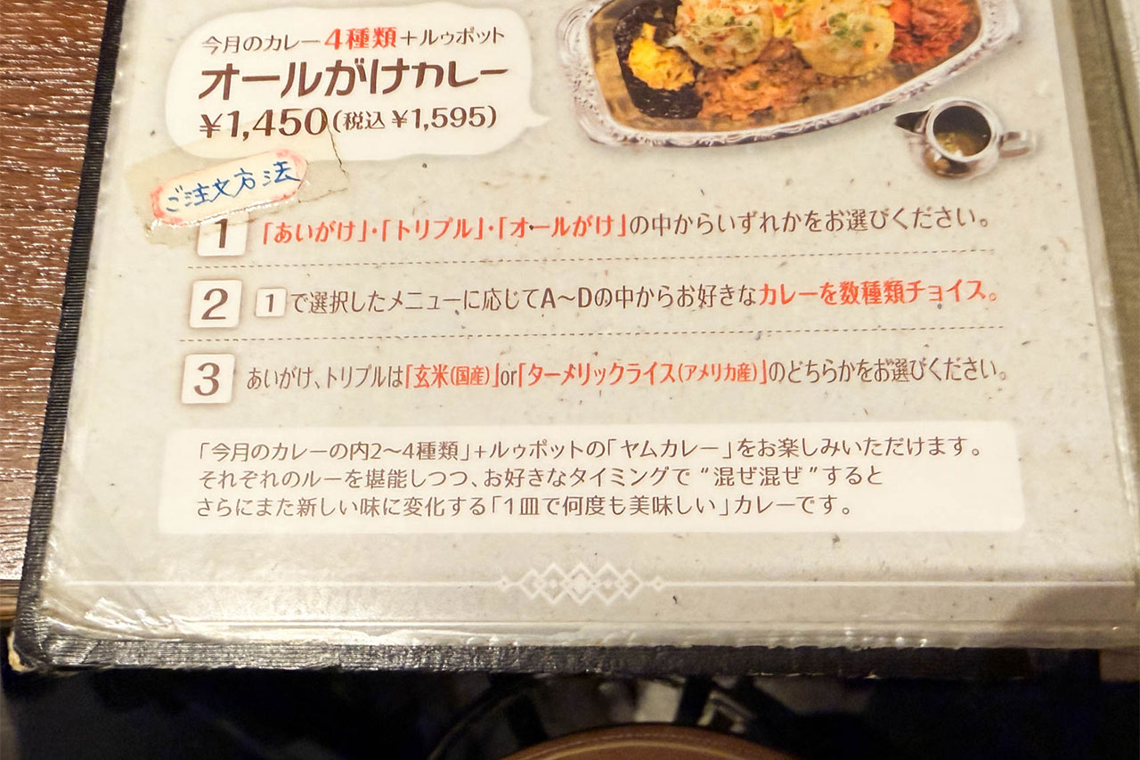 メニューがこちら。あいがけ(2種)・トリプル・オールから選択して、月替わりカレーの中からどれを組み合わせるかを選びます。あと平日限定で、ルゥポットの「和風出汁のヤムカレー」をタイカレーに変更できるそうです。