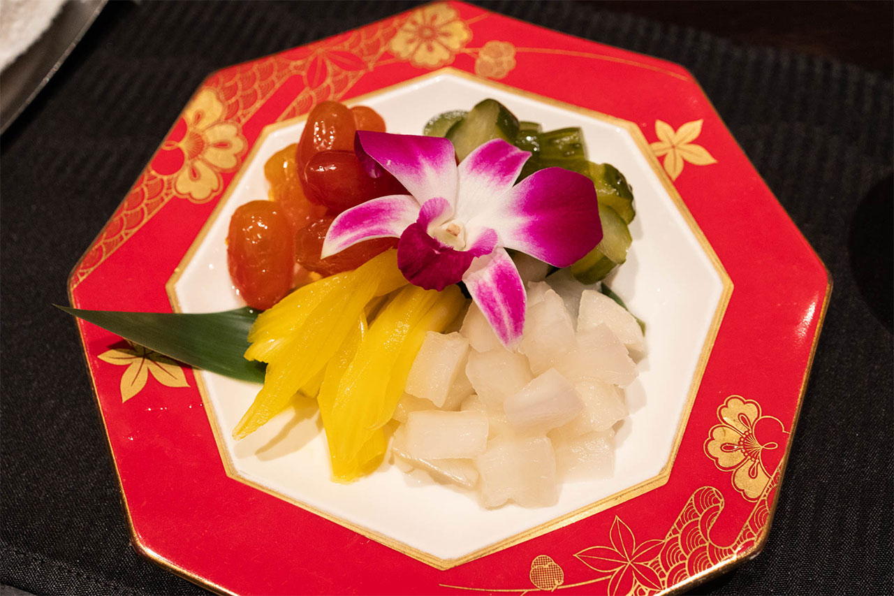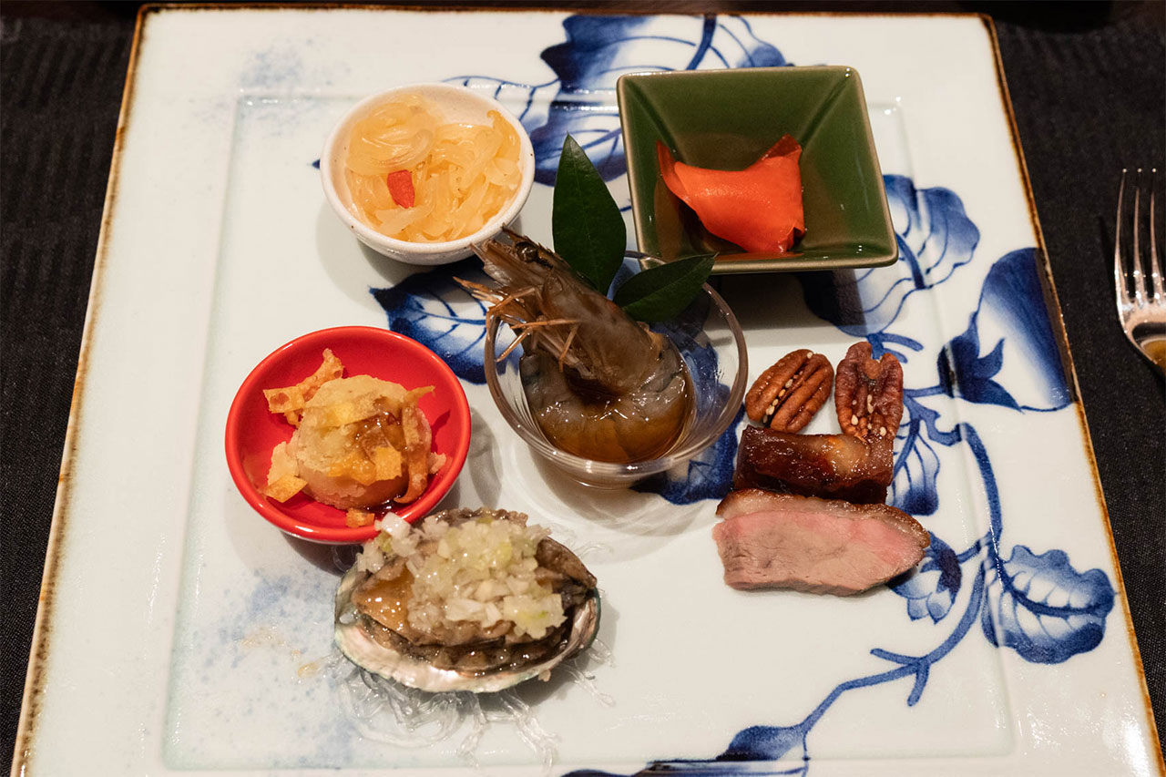 前菜七種盛り合わせ。左上から時計回りに、くらげ・赤かぶ・ピーカンナッツ・豚肉チャーシューと鴨肉チャーシュー・蒸し鮑のネギソース添え・さつまいものポテトサラダ・海老の紹興酒漬け。鮑が最高でした。