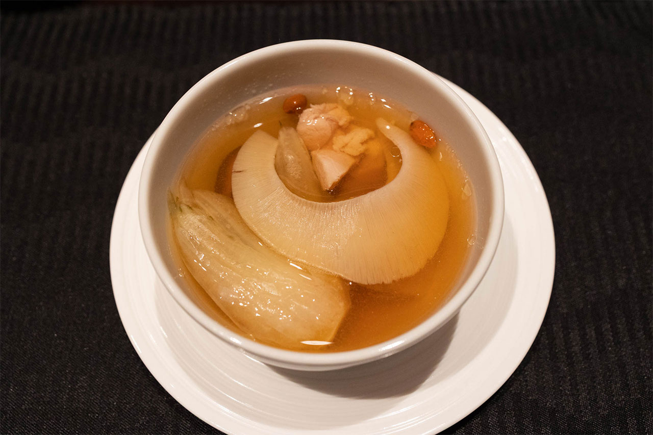フカヒレ姿と花椎茸の蒸しスープ。中国の山芋が入っていてシャクッとした食感が良かったです。椎茸と干し貝柱の出汁が最高でした。