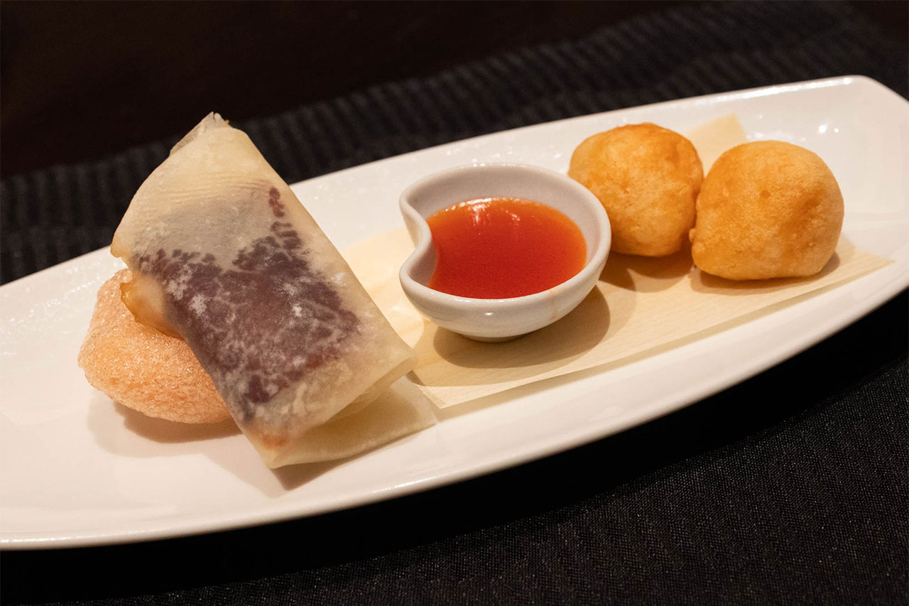 北京ダックと海老団子のフリッター。海老団子は奥さんがこの日一番好きだったと言ってました。弾力と甘みがすごくて僕もかなり好みでした。