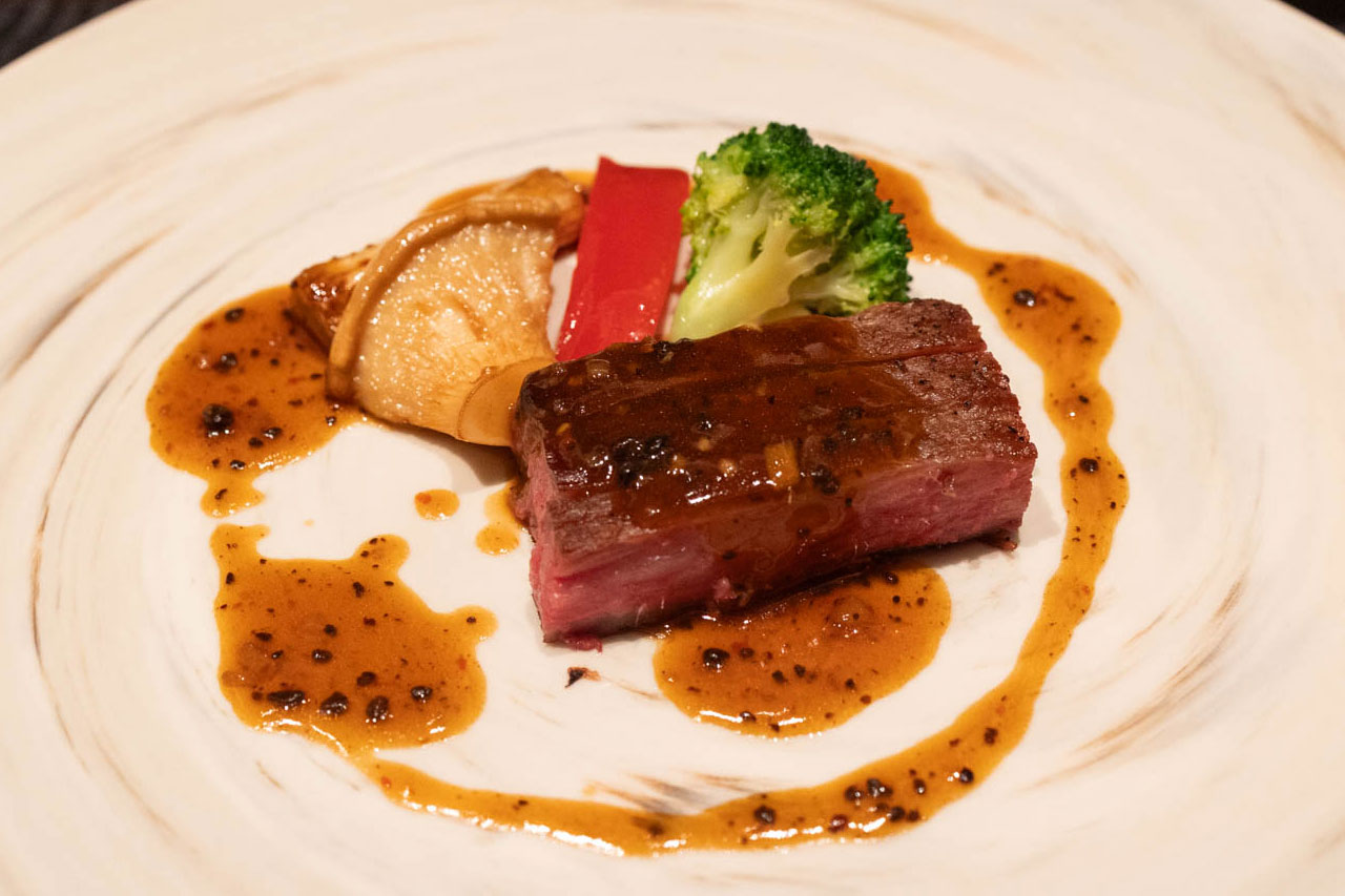 和牛サーロインのブラックビーンズ炒め。和牛自体の旨みもすごいし、ソースも添えられた野菜も美味しかったです。