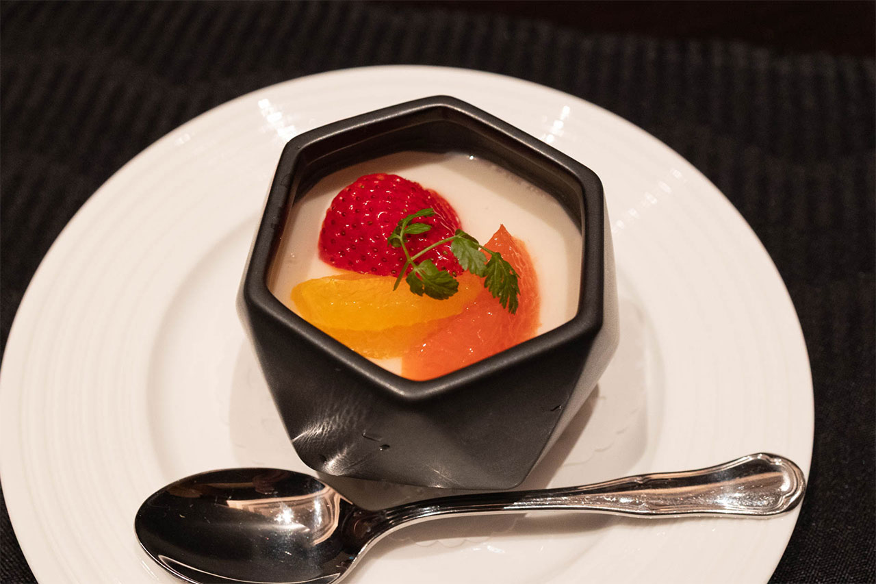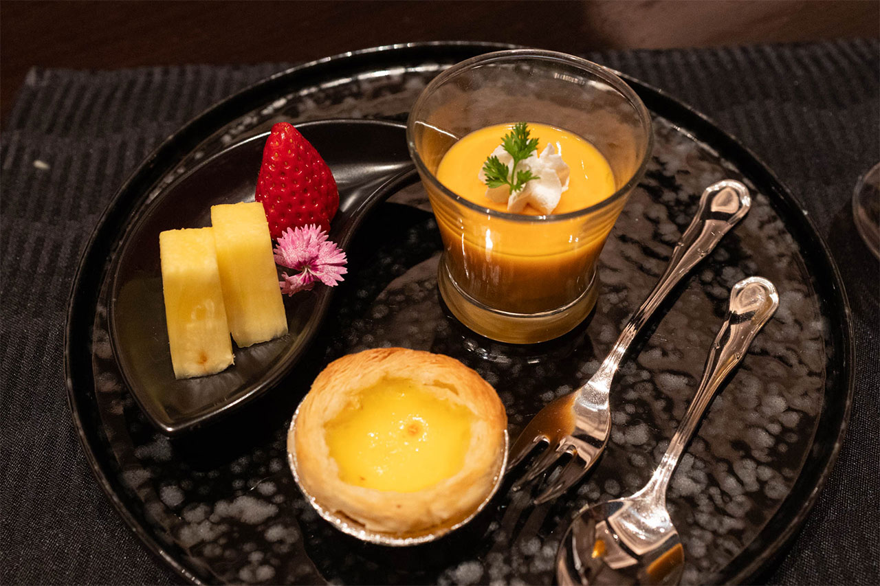 そしてここでコースに戻ってデザートの盛り合わせ。フルーツ盛り合わせとマンゴープリンとエッグタルト。