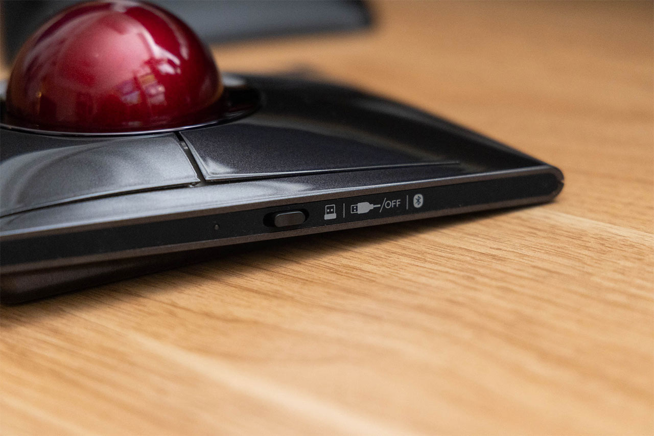 本体の左側にはスイッチがあり、接続方法が選べます。Bluetoothでもいいんですが、最近Bluetooth接続が不安定でExpertMouseから買い換えたこともあり、2.4GHz帯のワイヤレスで使うようにしました。