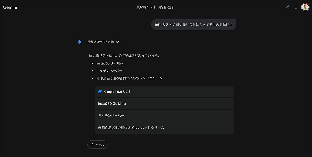 このように、ToDoリストだけだとただの買い物リストなんですが、Geminiと組み合わせることでより便利になります。
