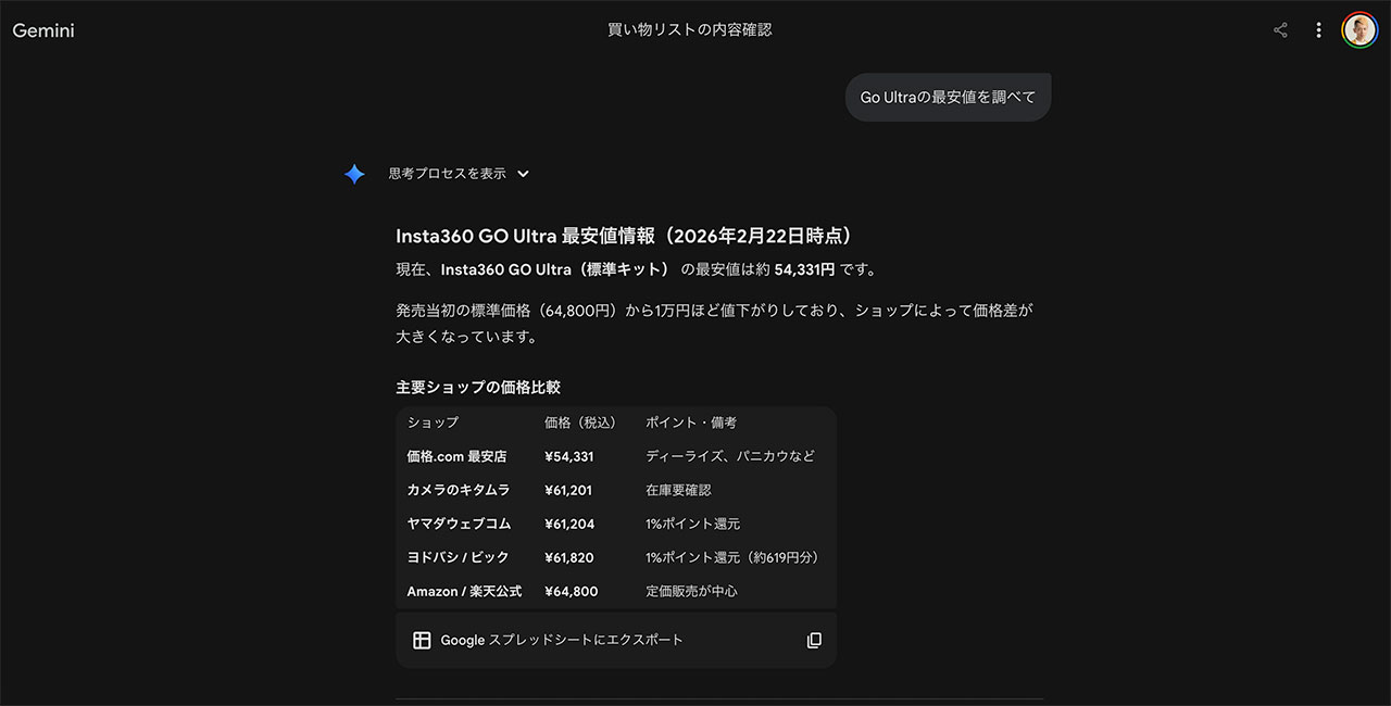 Insta360のGo Ultraを買いたいなと思っていて、最安値を聞いてみたのがこちら。