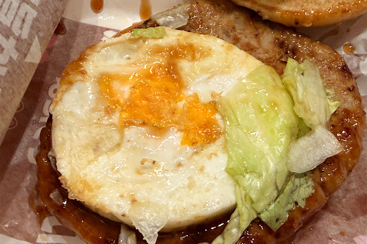 基本的なてりやきバーガーと同じで、ポークパティに甘辛いてりやきソースとシャキシャキレタス。そこに目玉焼きっぽい感じの卵と「かるび焼肉風フィリング」が加わります。