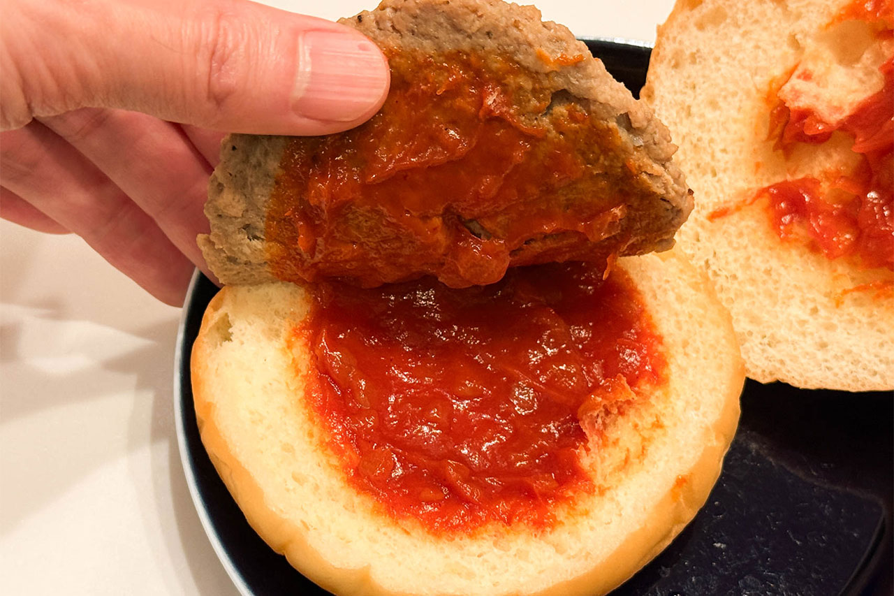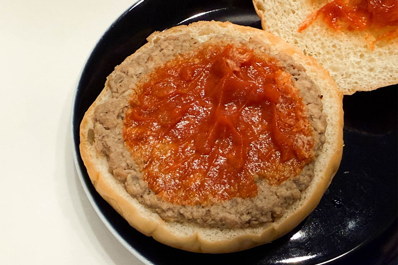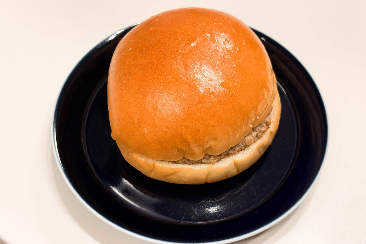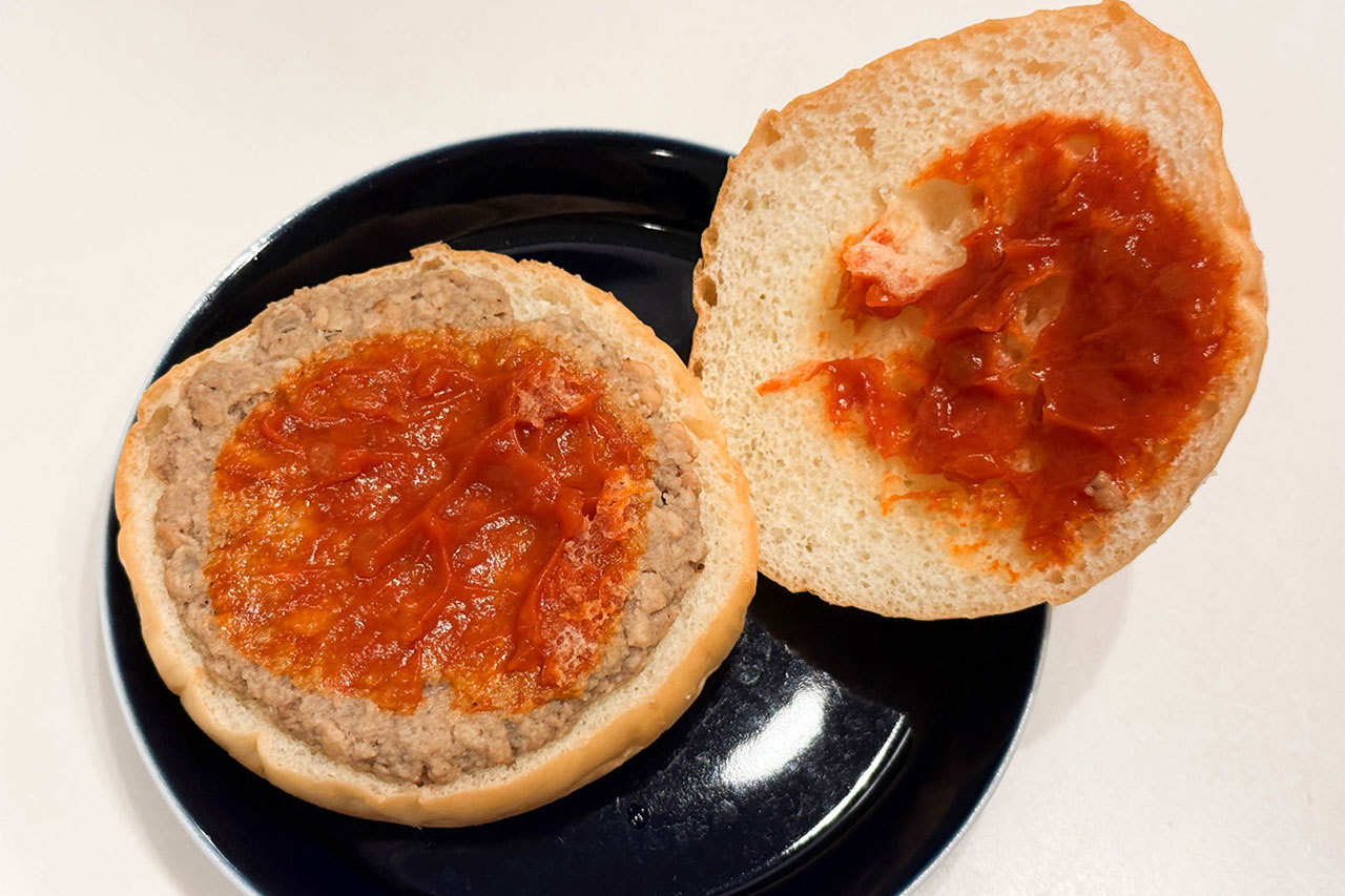 バンズのクラウンを取ると、パティの上側にたっぷりとうまトマハンバーグでお馴染みのトマトソースが塗られてます。