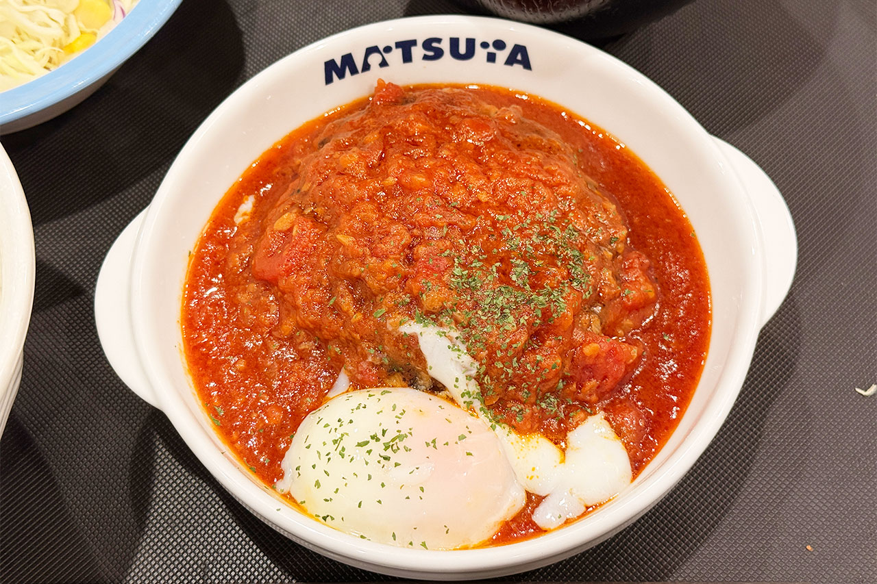 ニンニクのパンチがかなり強めなトマトソースは、甘さと酸味のバランスが良くて最高です。まさに松屋のうまトマっていう感じでした。