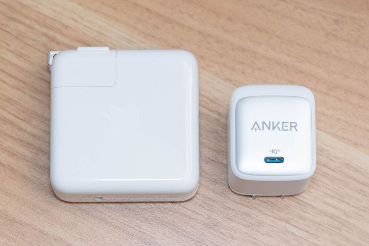 重さももちろん違っていて、Apple純正の70Wのアダプターは約165g、Anker Nano II 65Wは約112gということで、50gの差は結構大きいですからね。